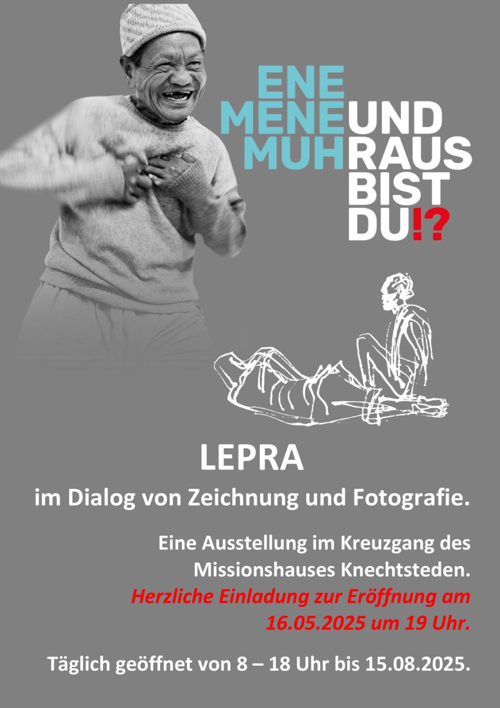 Ab dem 16. Mai ist im Kreuzgang des Klosters Knechtsteden die eindrucksvolle Ausstellung „Ene Mene Muh – und raus bist du!?“ zu sehen. Sie zeigt bewegende Porträts von Menschen mit Lepra, die nicht als Opfer, sondern als selbstbewusste Persönlichkeiten dargestellt werden. Die Fotografien von Christopher Thomas entstanden in den 1990er-Jahren in Nepal, die Zeichnungen von Sr. Tisa Gräfin von der Schulenburg nach Begegnungen in Äthiopien.
